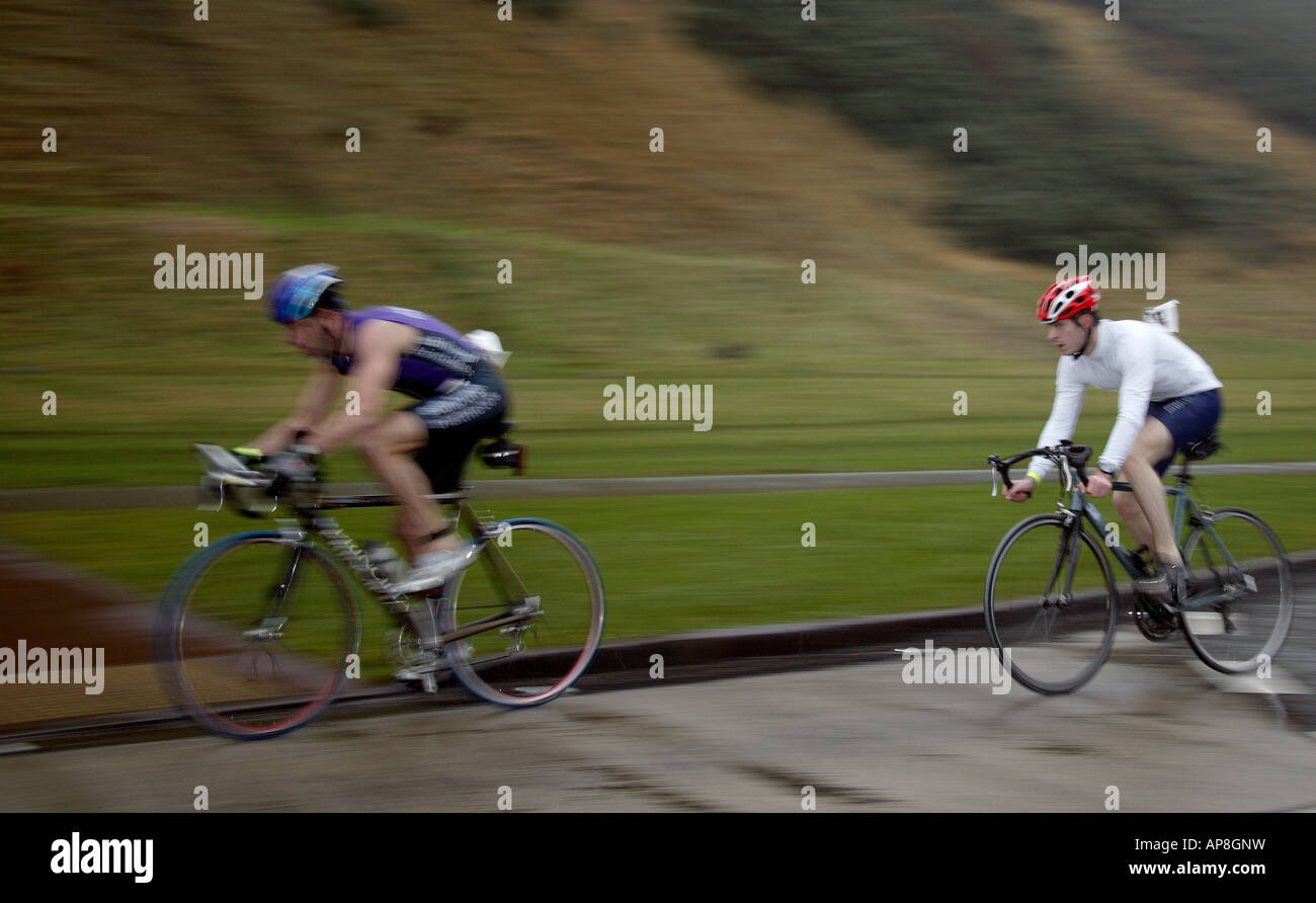 wo Male Cyclists competing in the New Years Day Triathlon, Holyrood Park, Edinburgh, Scotland