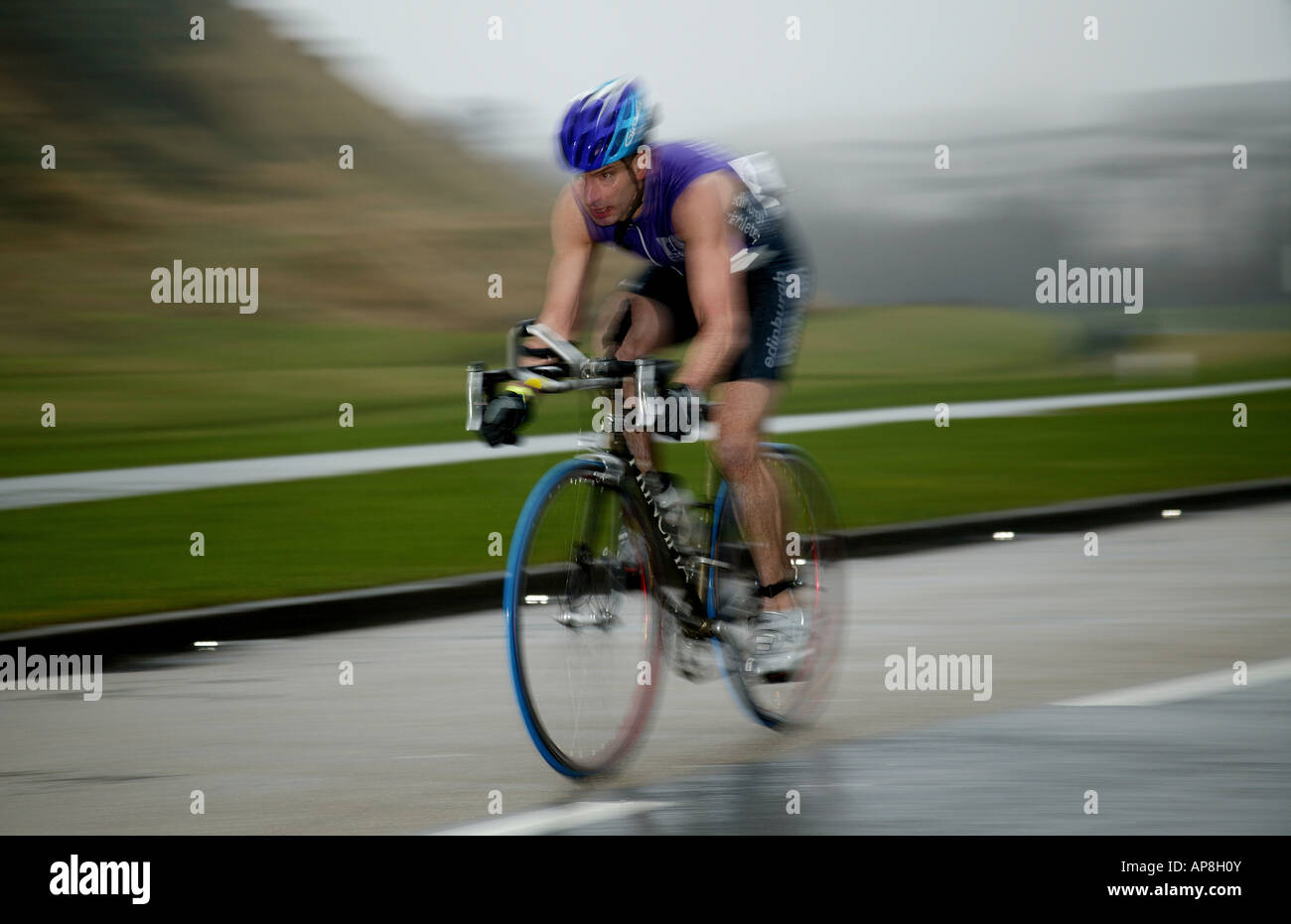 Male Cyclist competing in the New Years Day Triathlon, Holyrood Park, Edinburgh, Scotland, UK