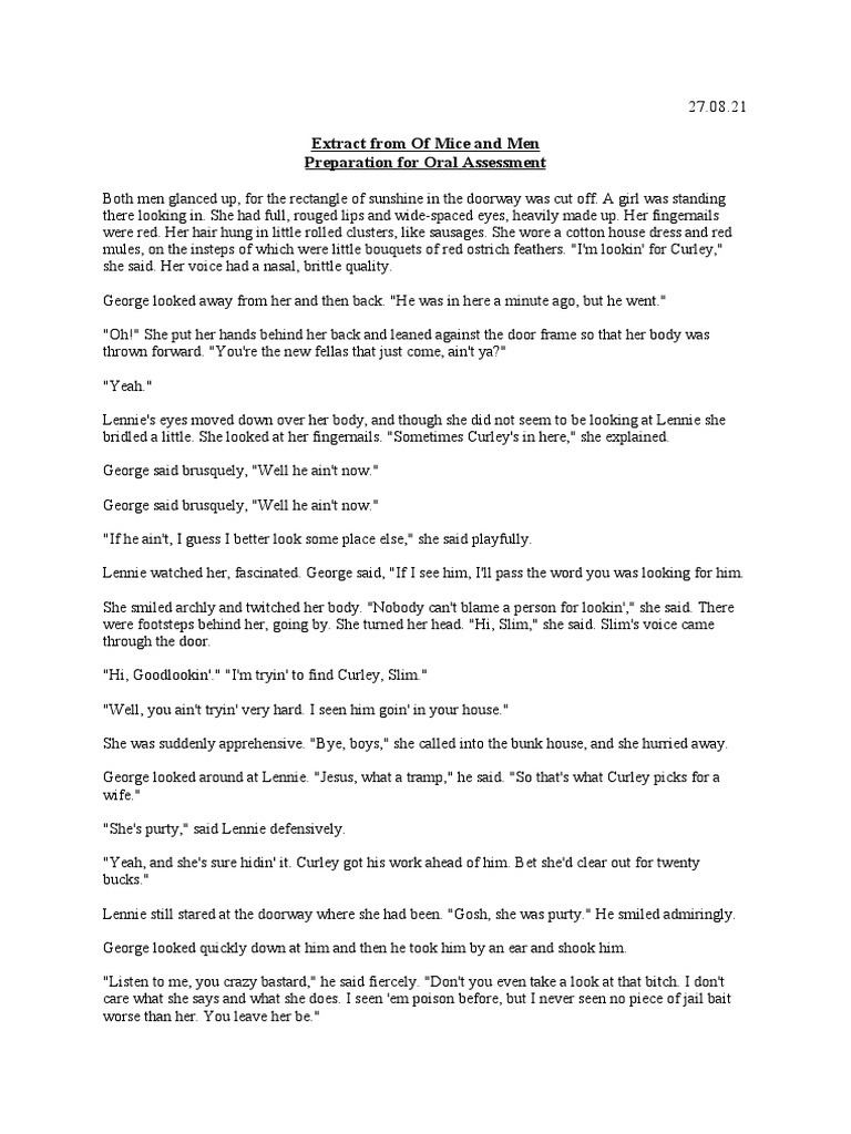 Of Mice and Men - Extract 1. This Literature quiz is called 'Of Mice and Men - Extract 1' and it has been written by teachers to help you if you are studying the subject at senior high school. Playing educational quizzes is one of the most efficienct ways to learn if you are in the 11th or 12th grade - aged 16 to 18.