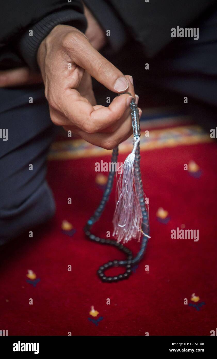 A Muslim holds prayer beads at the Al Furqan Islamic Centre in Glasgow, Scotland, ahead of the