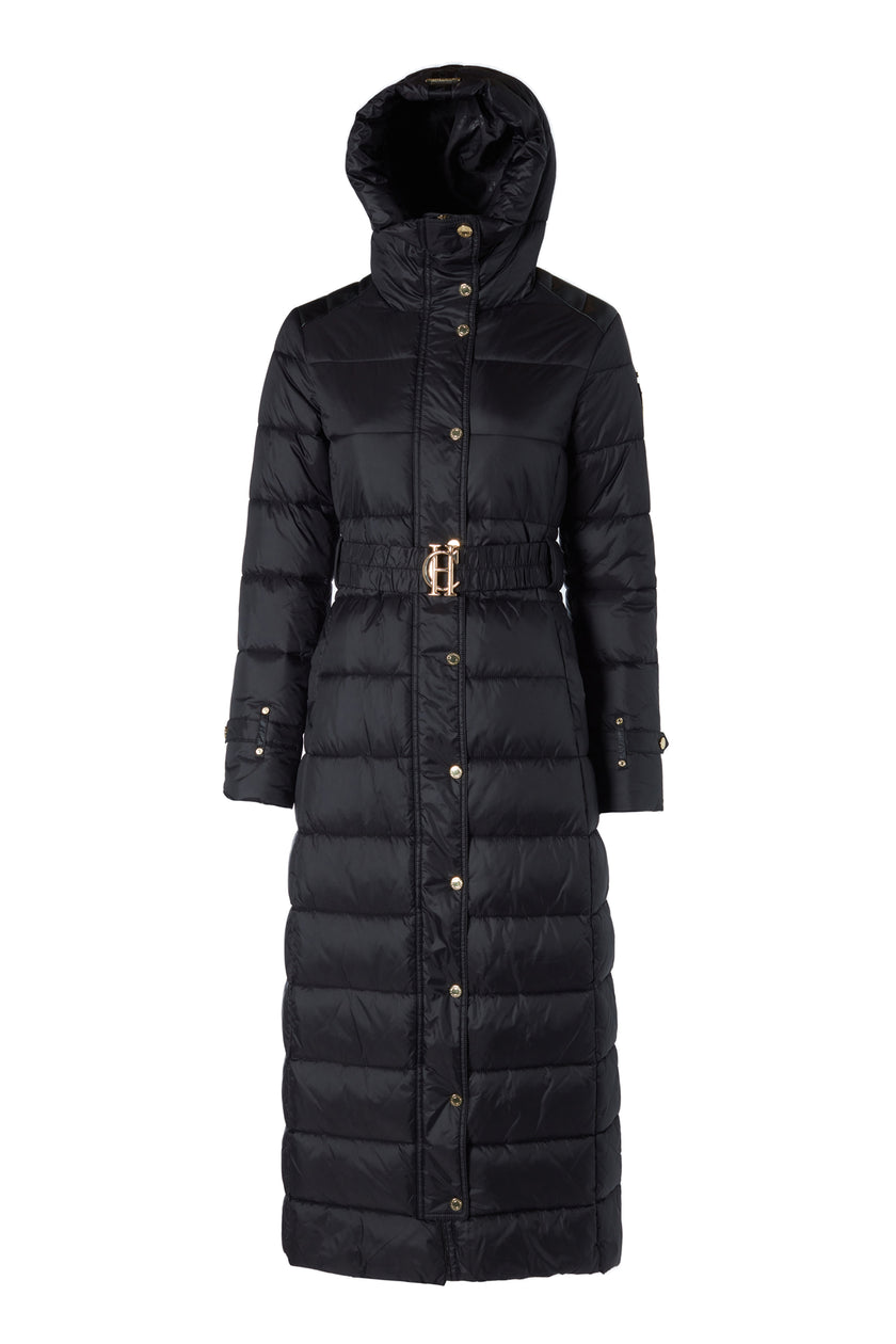 The Arosa Longline Coat. £399.00. Providing a slimming silhouette with its integrated belt to cinch you in, this coat is an elegant and sophisticated alternative to your typical padded outerwear. Filled with a premium eco fill for ultimate warmth and decorated with gold metal hardware. Detailed with a jacquard branded belt with iconic HC gold.
